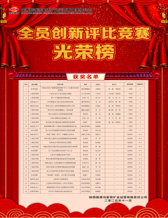 近期,馮家塔運營組織開展了2025年第四次全員創新評比競賽。會上對技術創新類、工器具革新類、智能化創新類、創新管理法類、精優作業法類、創意金點子類等六類、共計30項全員創新項目進行了評審,會上經過嚴格評選,最終確定26項創新項目獲獎。其中一等獎2項、二等獎3項、三等獎6項、優秀獎15項。